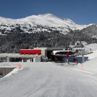 Ausfahrt der Kabinenbahn in Canols. Bei den Stationen handelt es sich um die ersten Uni-G-Viper-Stationen der Schweiz, Dezember 2010