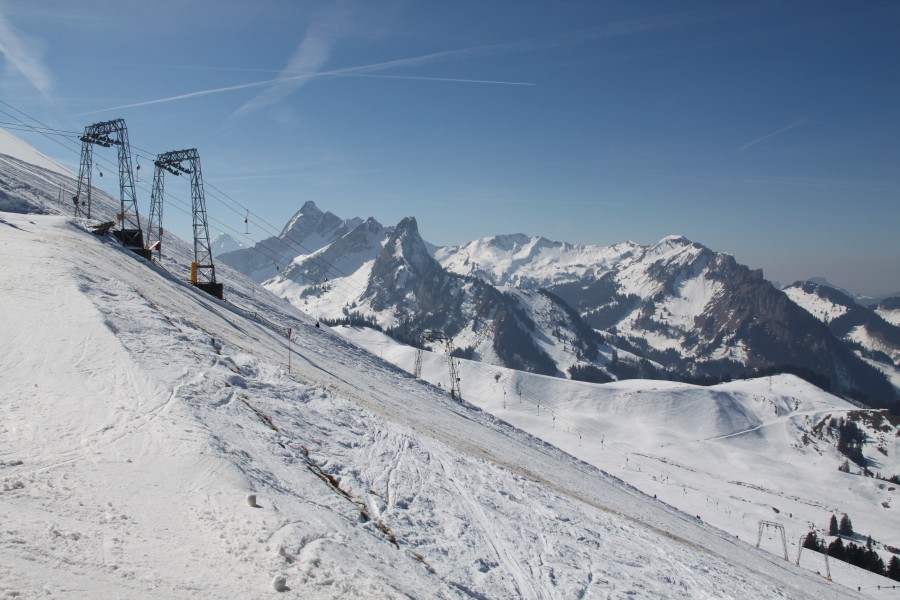 Blick von der blauen Abfahrt zu den Schleppliften Geissalp, im Hintergrund die Kaiseregg, März 2011