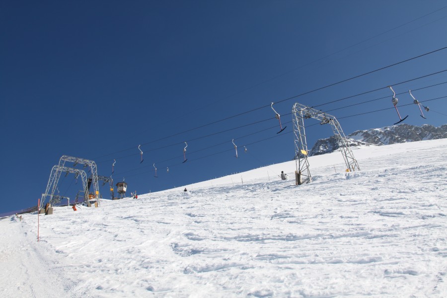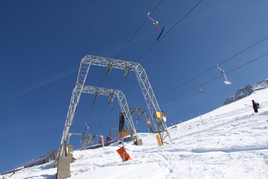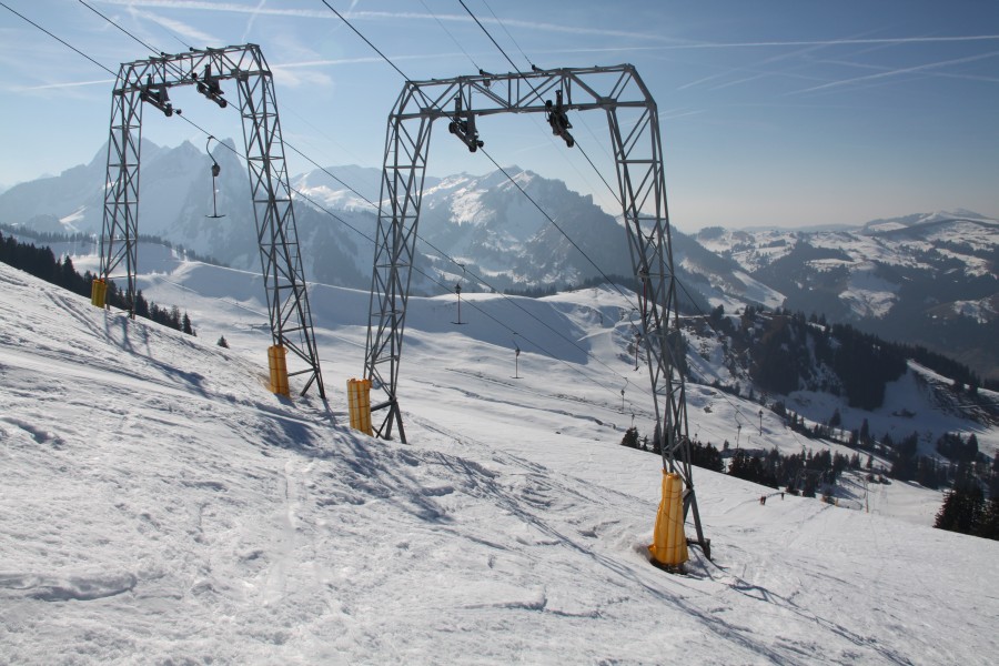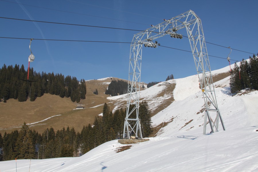 Schlepplifte Geissalp. Deutlich zu erkennen ist die schmale Seilspur aufgrund des Totpunktausstiegs, März 2011