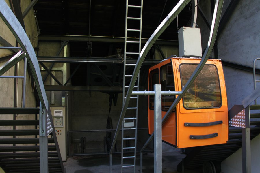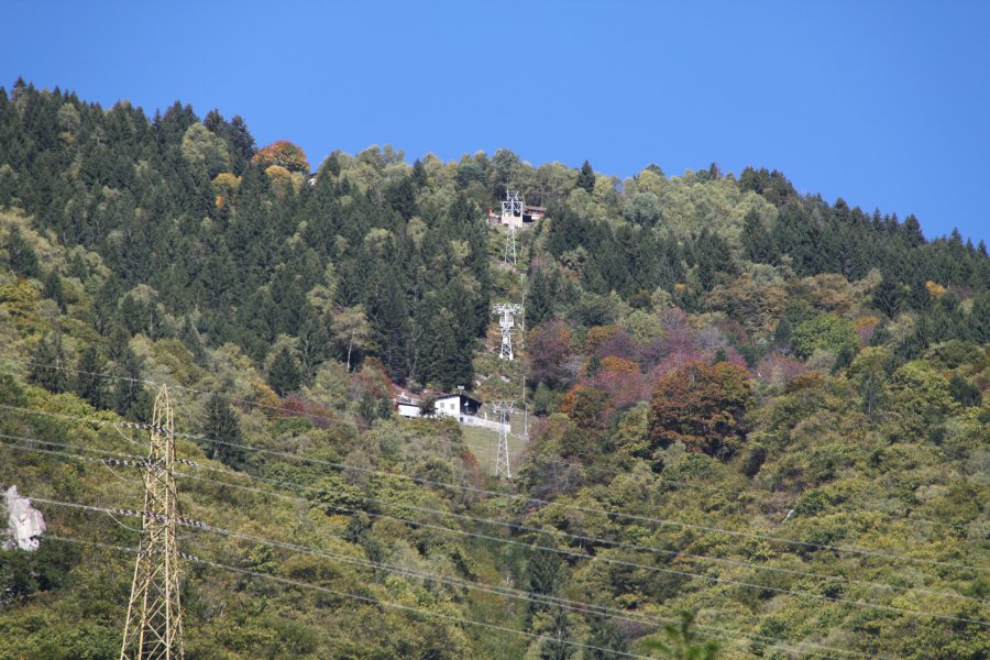 Zoom zur Bergstation und zum oberen Streckenteil der Luftseilbahn Lumino-Saurù, Oktober 2010