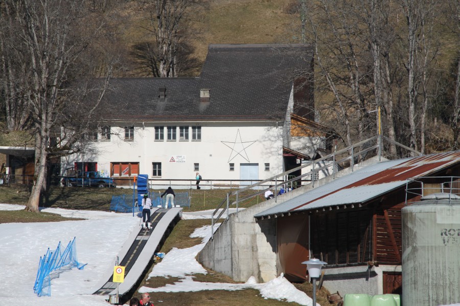 Zoom zur ehemaligen Talstation der Luftseilbahn Wengen-Männlichen weiter oberhalb, März 2011
