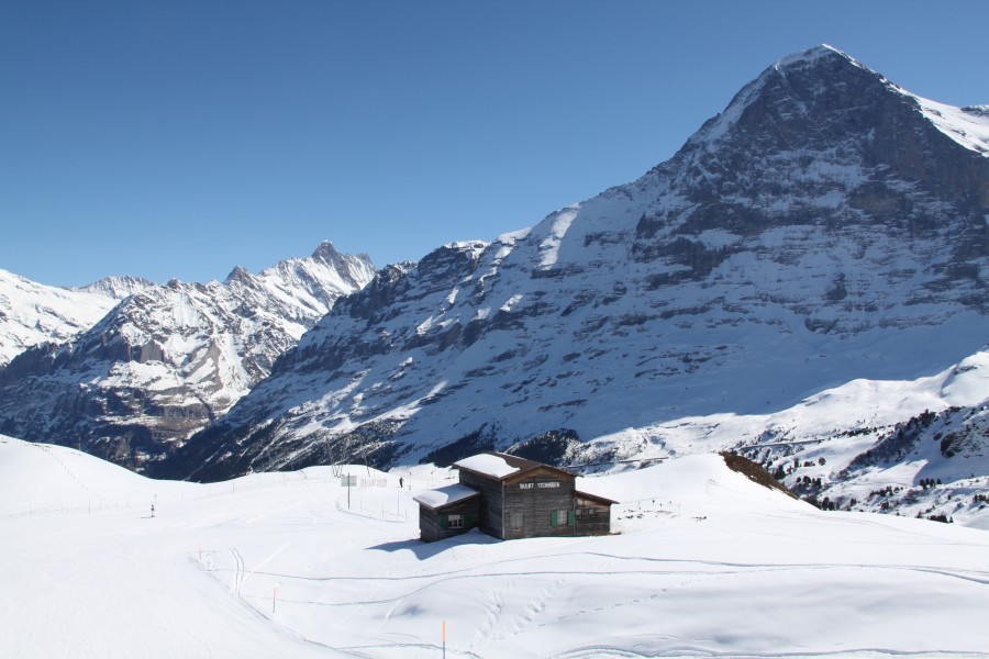 Bergstation des letzten verbliebenen Habegger-Schlepplifts im Gebiet, dem Schlepplift Tschuggen mit dem Eiger im Hintergrund, März 2011