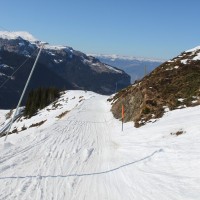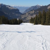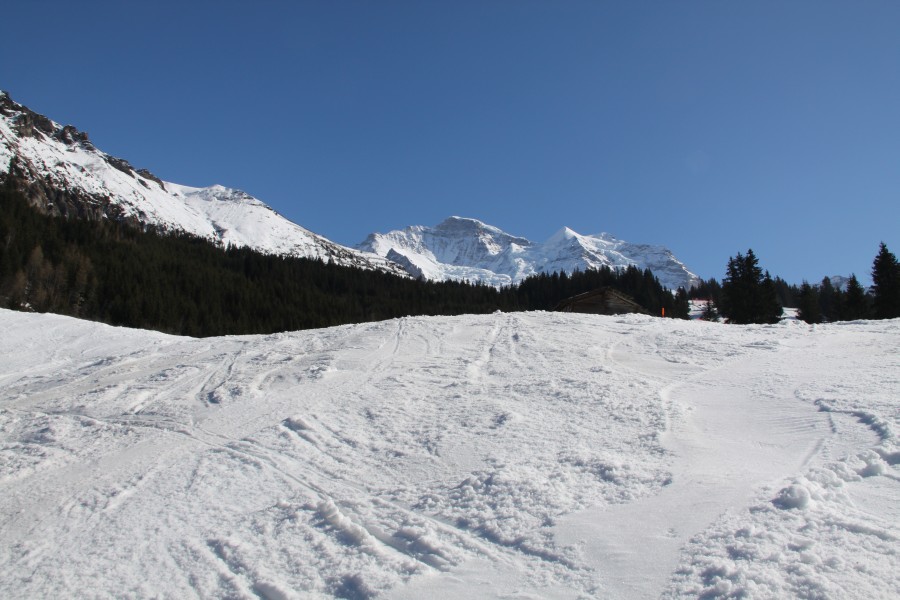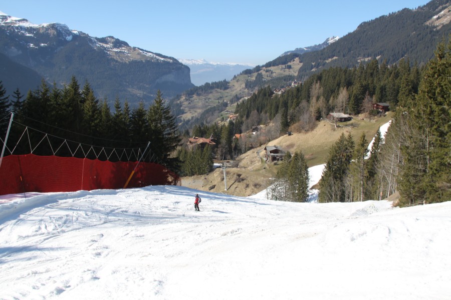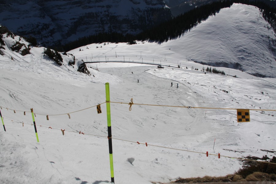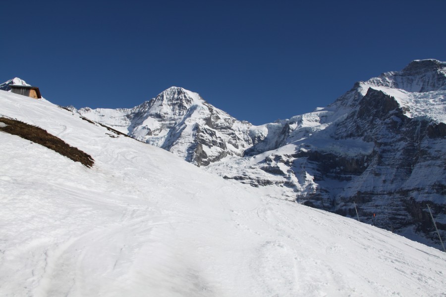 Minschkante der Lauberhornabfahrt mit Mönch und Jungfrau dahinter, März 2011