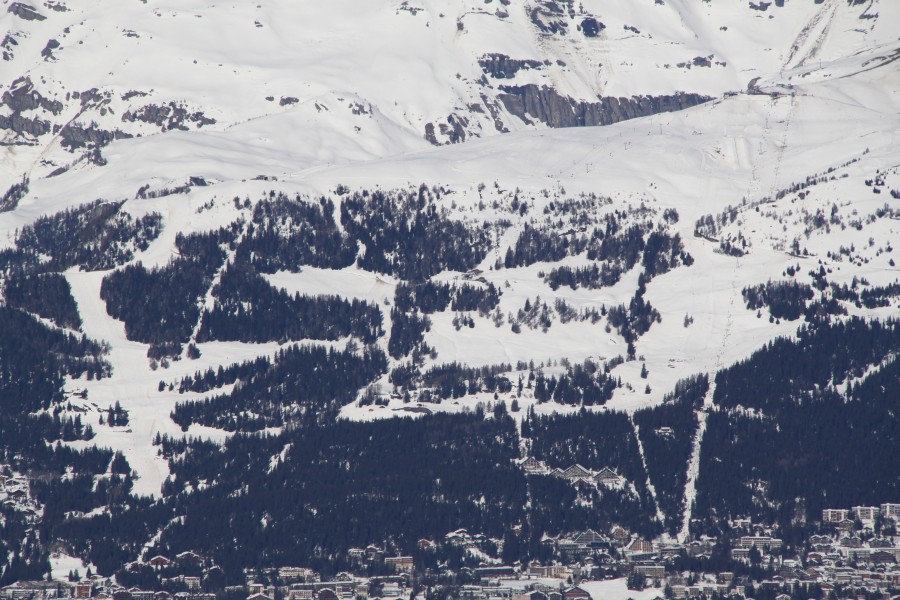 Das Skigebiet von Crans-Montana mit seinen zahlreichen Schneisen im Bereich des Cry d'Er. Nicht durch alle verlaufen heute noch Seilbahnen, März 2012