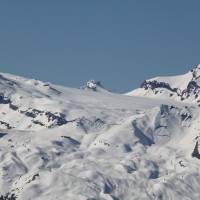 Zoom zum Glacier des Diablerets mit seinen drei Gletscherschleppliften und im Hintergrund der markanten Bergstation der Luftseilbahn Cabane des Diablerets-Glacier des Diablerets, März 2012