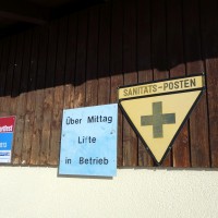 Schilder am Schlepplift Alp Sarn aus Zeiten, als eine Mittagspause am Schlepplift durchaus noch selbstverständlich war, Dezember 2012