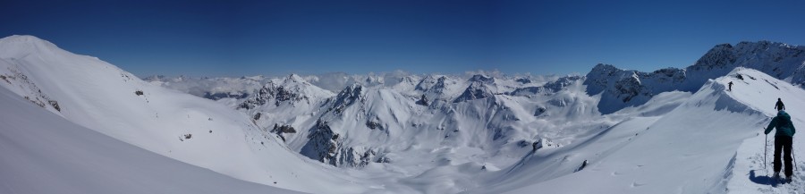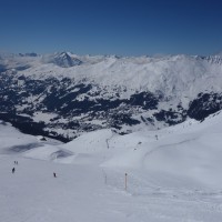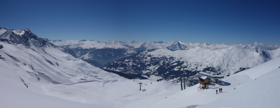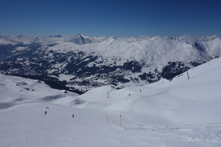 Blick von der Bergstation der Sesselbahn Motta-Schwarzhorn auf das Urdental und den Anlagen von Arosa auf der Rückseite des sichtbaren Grats, März 2013