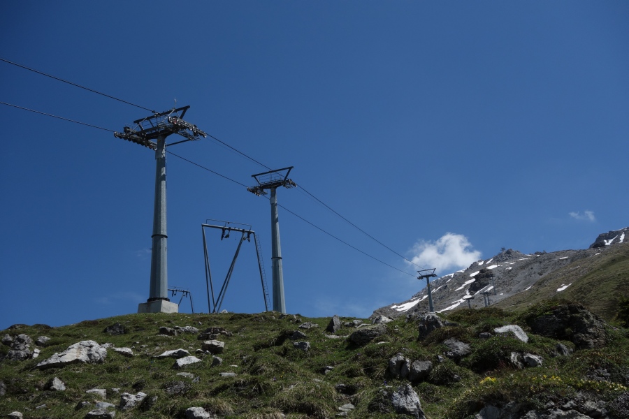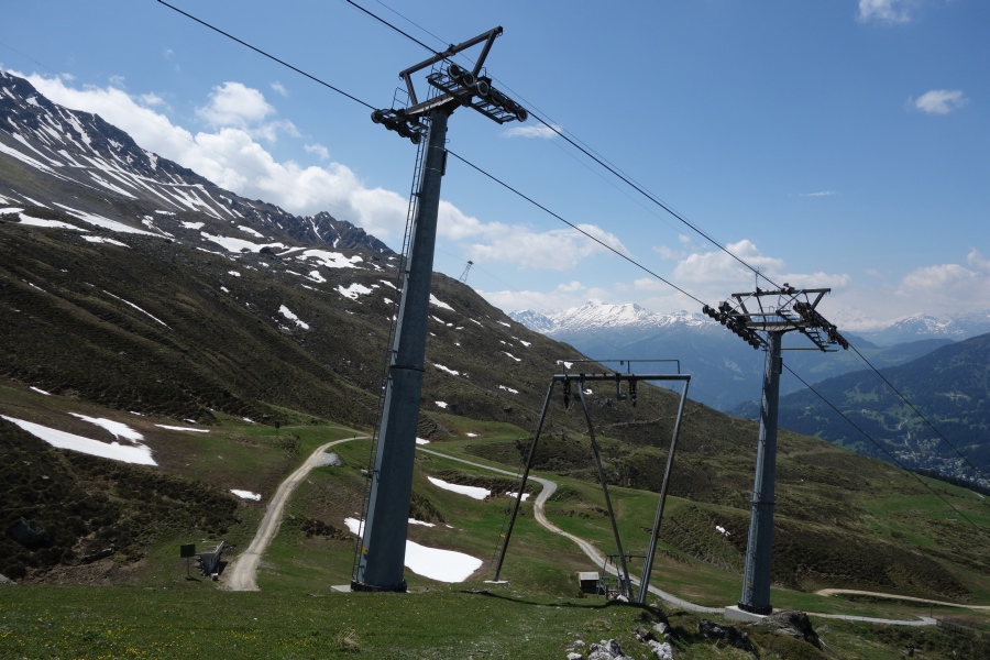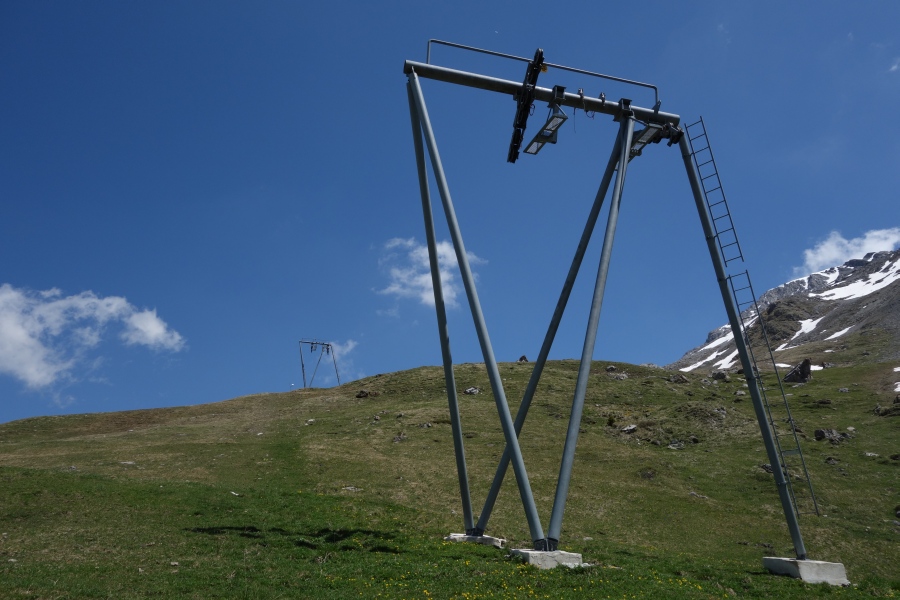 Kreuzung des Schlepplifts Weisshorn 2 mit der Sesselbahn Scharmoin-Weisshorn, Juni 2013