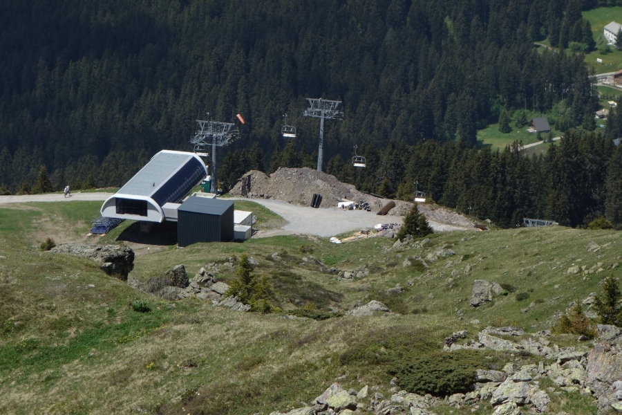 Bergstation der Sesselbahn Parpan-Heimberg mit sichtbarer Baustellenaktivität für die Sesselbahn Heimberg-Motta, Juni 2013
