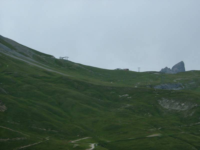 Bella Lui mit dem Gebäude der Luftseilbahn und dem Gebäude der alten Kabinenbahn von Oehler. Ausserdem zu sehen der Schlepplift Bella Lui, Juli 2005