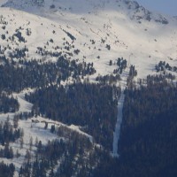 Zoom ins Skigebiet Nax, die Schneise im Wald gehört zum Leitner-Schlepplift Cabane, März 2008