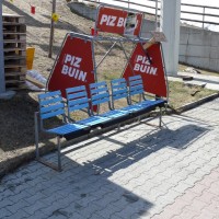 Ein Dorf weiter, in Unterbäch: Eine Bank erinnert an vergangene Zeiten, als hier noch eine Habegger Einersesselbahn ihre Dienste verrichtete, April 2009