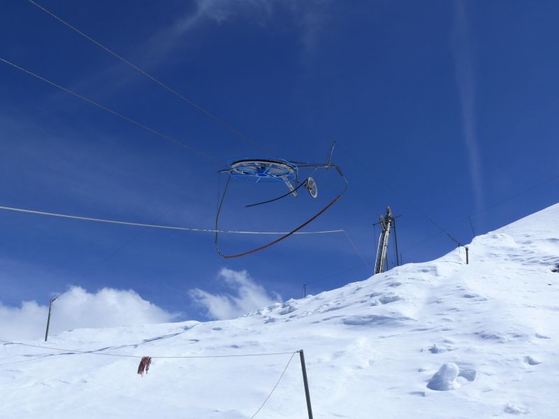 Bergstation des Poma-Schlepplifts Furggen 1 mit der typischen fliegenden Umlenkscheibe, April 2009