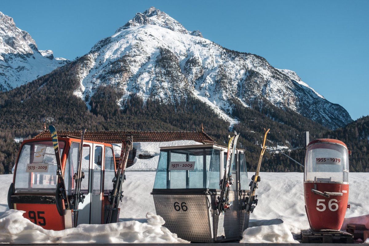 Kabinen der Vorgängergenerationen der Kabinenbahn Scuol-Motta Naluns, März 2021
