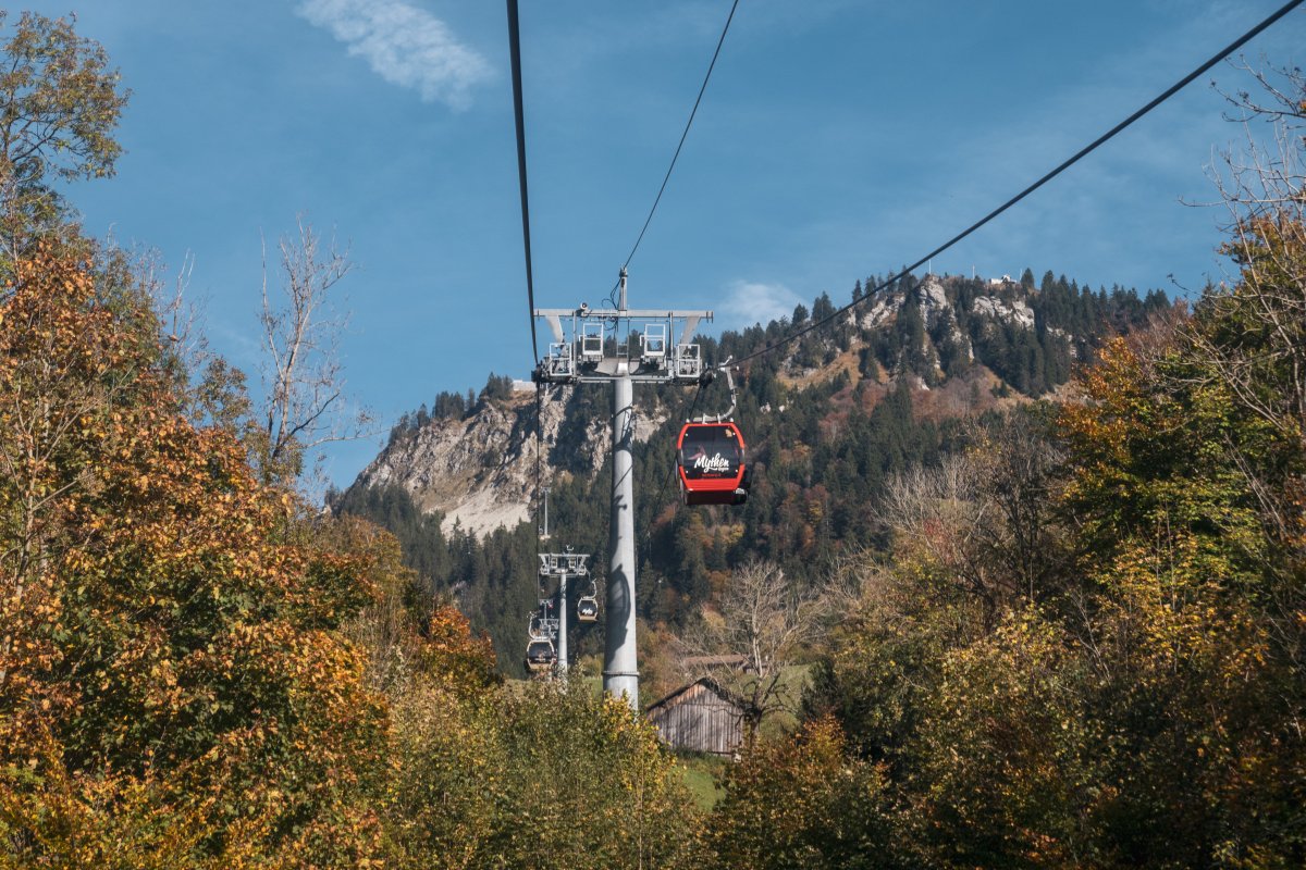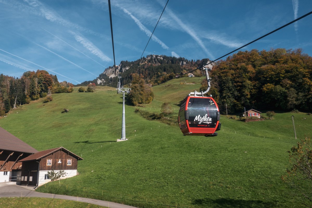 Nach einem Jahrzehnt ohne Seilbahn erschliesst seit 2014 wieder eine Anlage die Rothenflue oberhalb von Rickenbach bei Schwyz. Die Kabinenbahn ist Zubringer in das reizvolle Ski- und Wandergebiet in der Mythenregion.