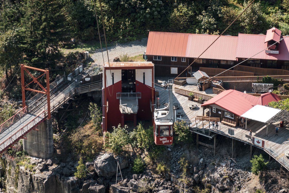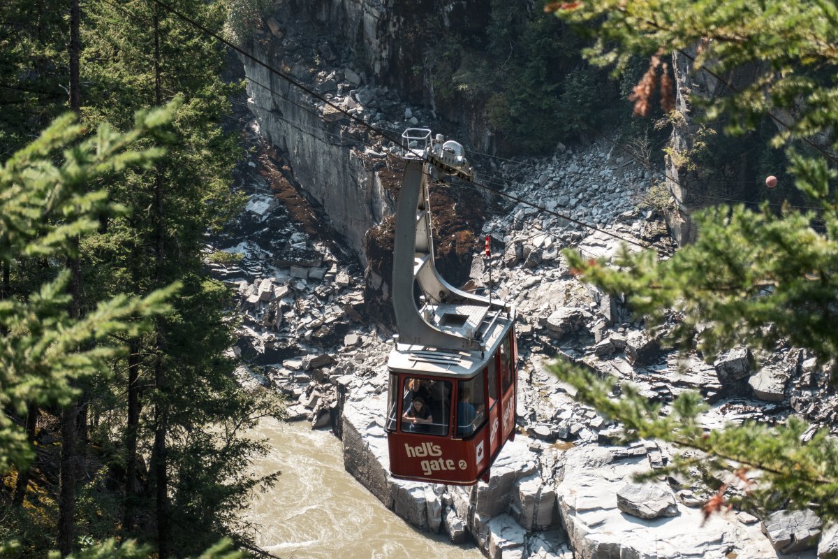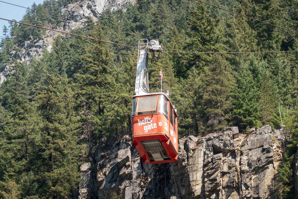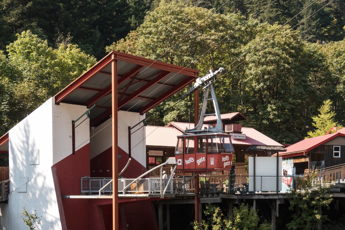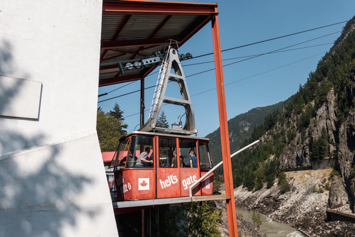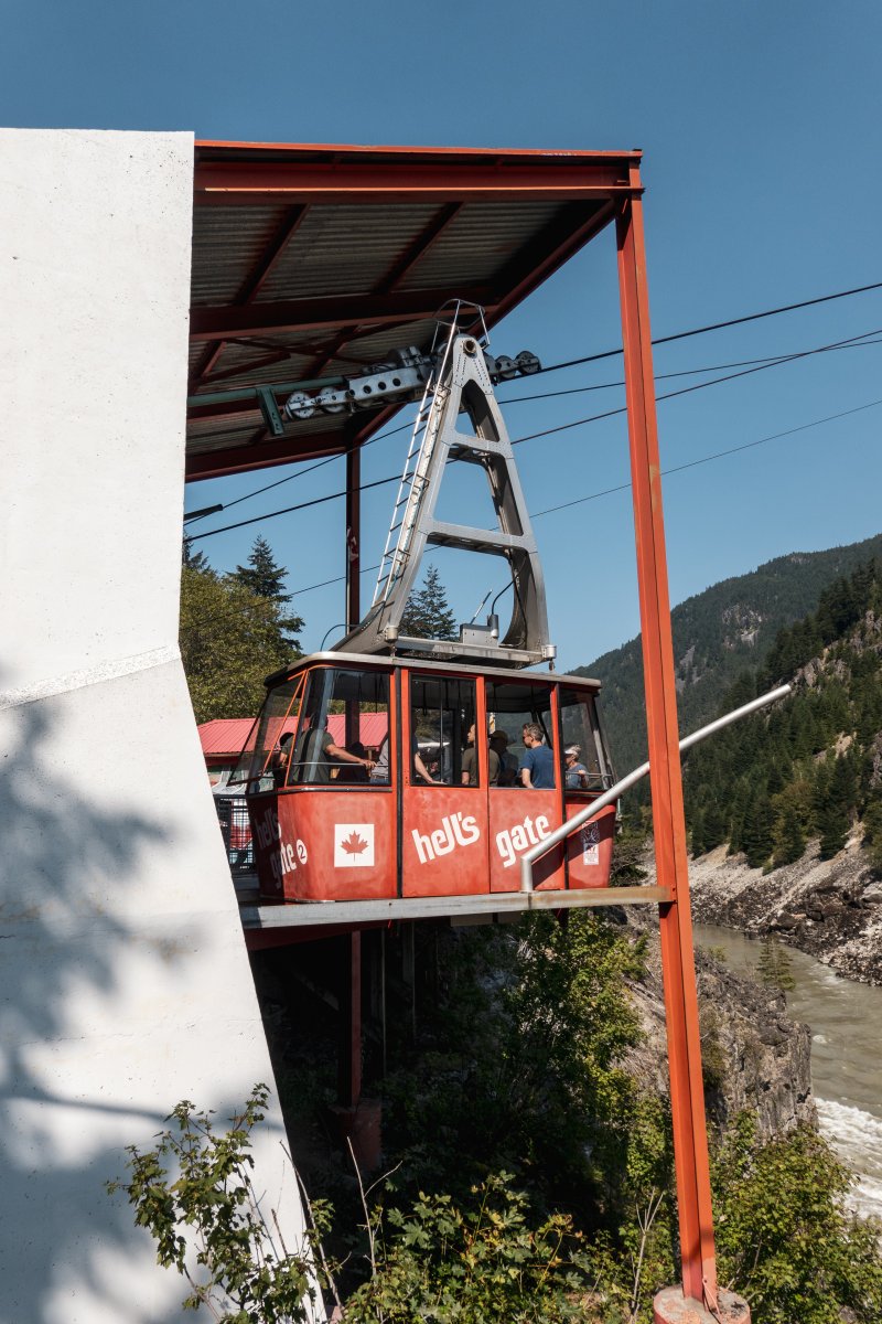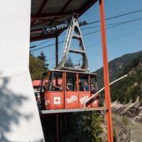 Eine kleine Pendelbahn von Habegger überquert den reissenden Fraser River zum Hell's Gate nordöstlich von Vancouver.