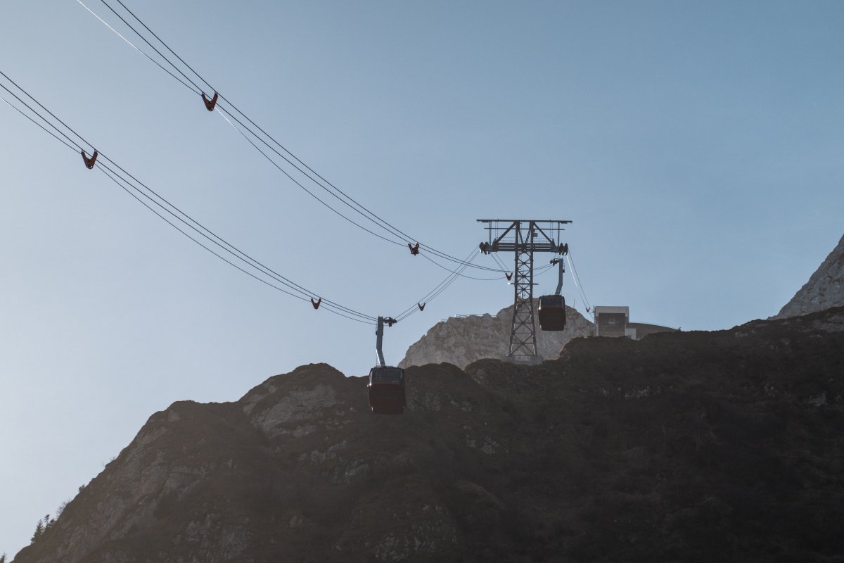 The Fräkmüntegg-Pilatus Kulm cable car in Kriens (built in 2015) spans a distance of 1388 meters, covering an elevation difference between 1421 m and 2068 m. It was built by Garaventa. The maximum capacity is 589 people per hour.