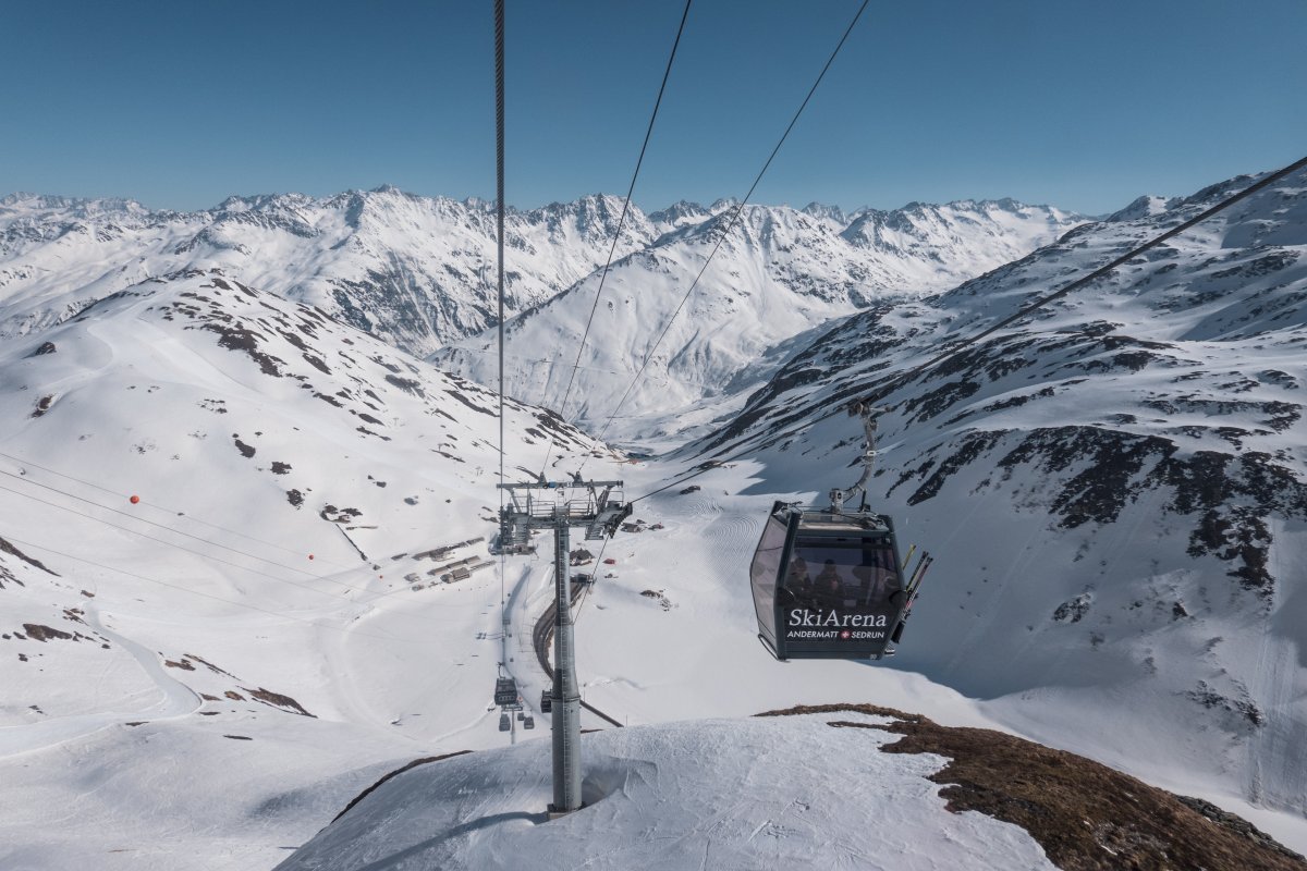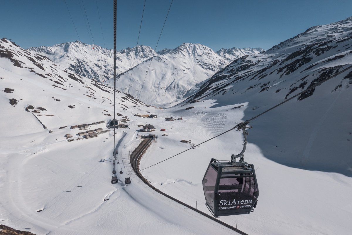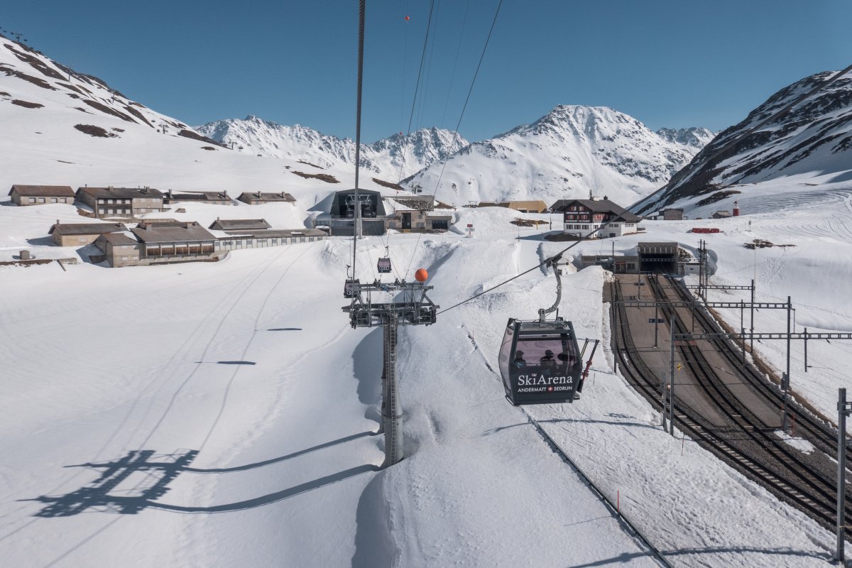 With a length of 1710 meters, the Oberalppass-Platten-Schneehühnerstock cable car in Andermatt (Uri) connects stations at elevations of 2049 m and 2596 m. The cable car was built in 2018 by Leitner. The maximum capacity is 2000 people per hour.