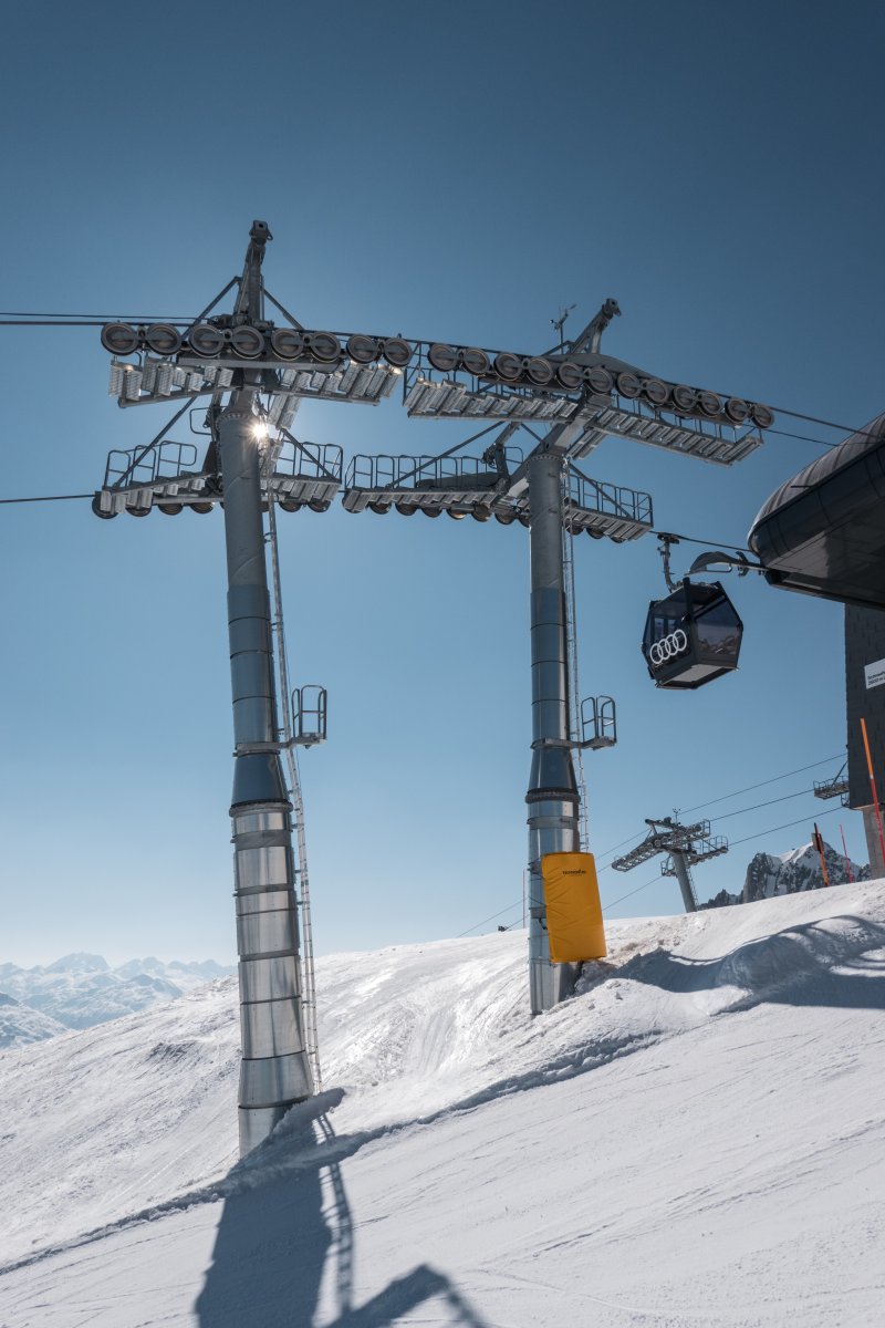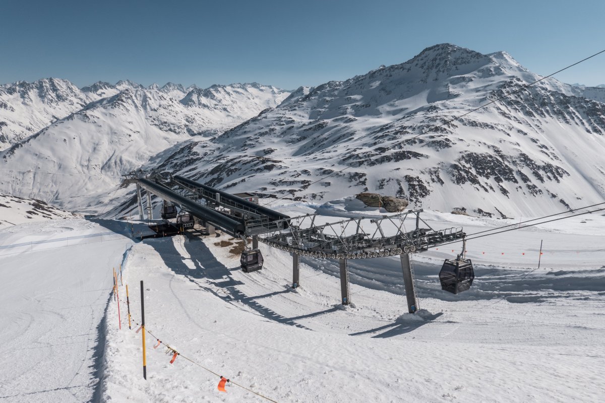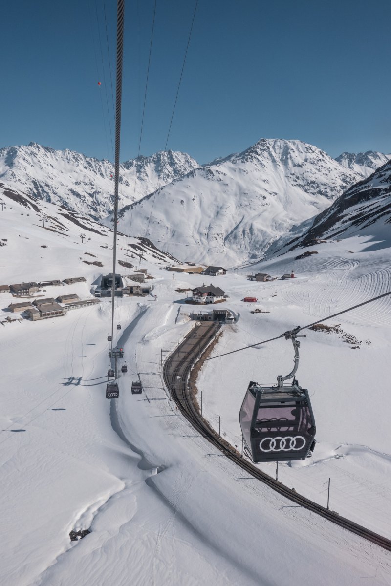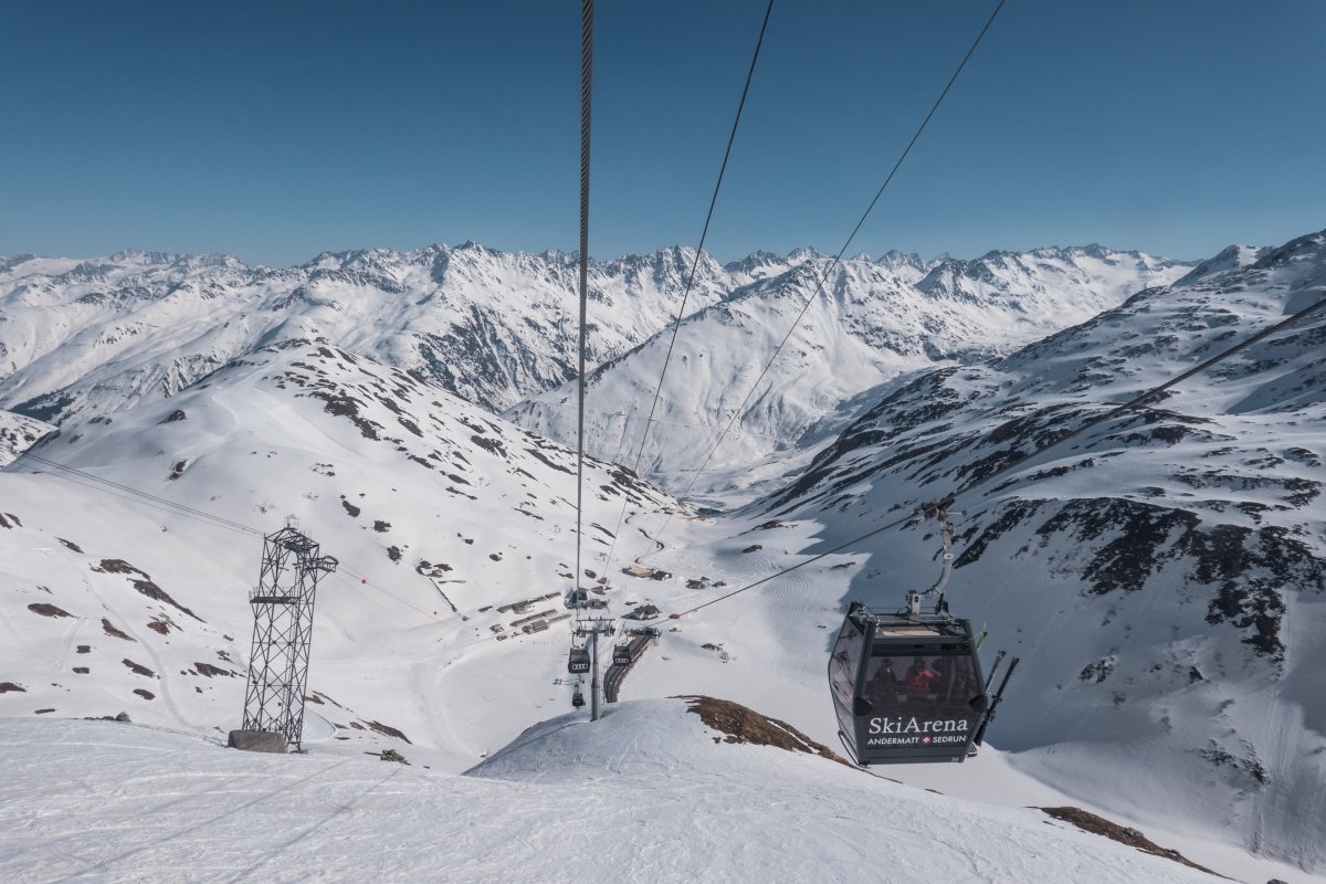 With a length of 1710 meters, the Oberalppass-Platten-Schneehühnerstock cable car in Andermatt (Uri) connects stations at elevations of 2049 m and 2596 m. The cable car was built in 2018 by Leitner. The maximum capacity is 2000 people per hour.