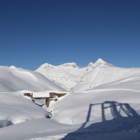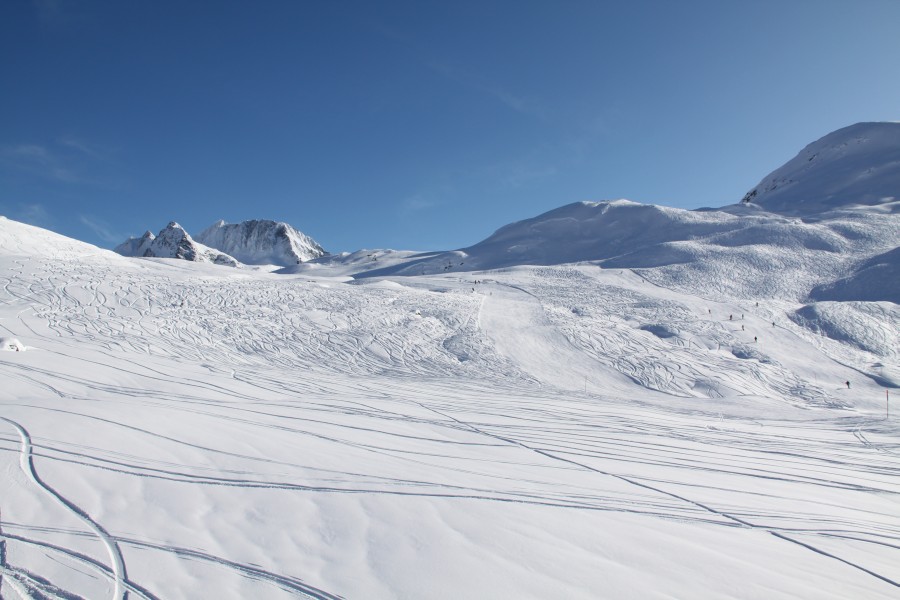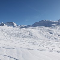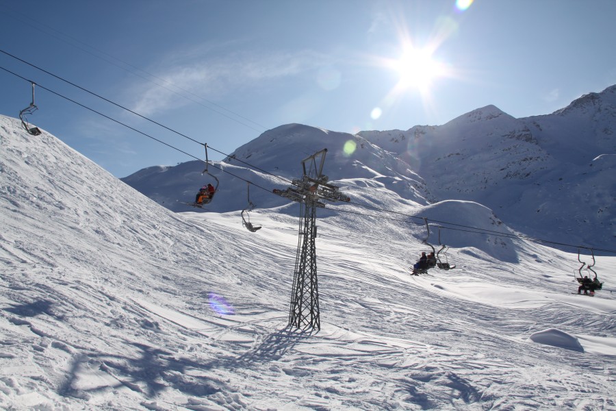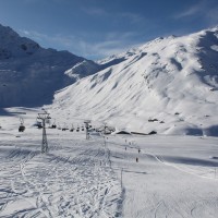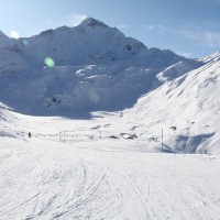 Blick auf die schier unendlichen Weiten des Skigebietes von Splügen und auf die Tamboalp samt zugehöriger Sesselbahn. Im Hintergrund der markante Gipfel des Piz Tambo, Dezember 2009