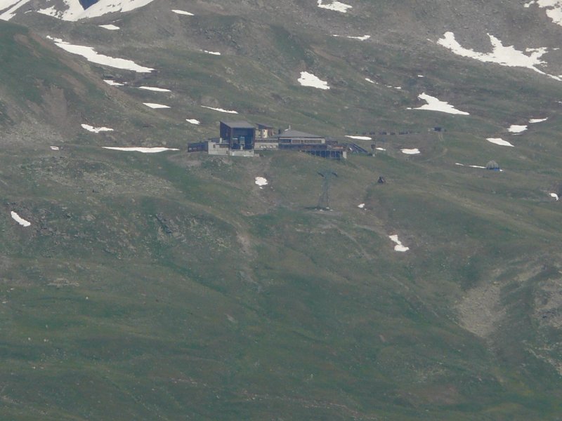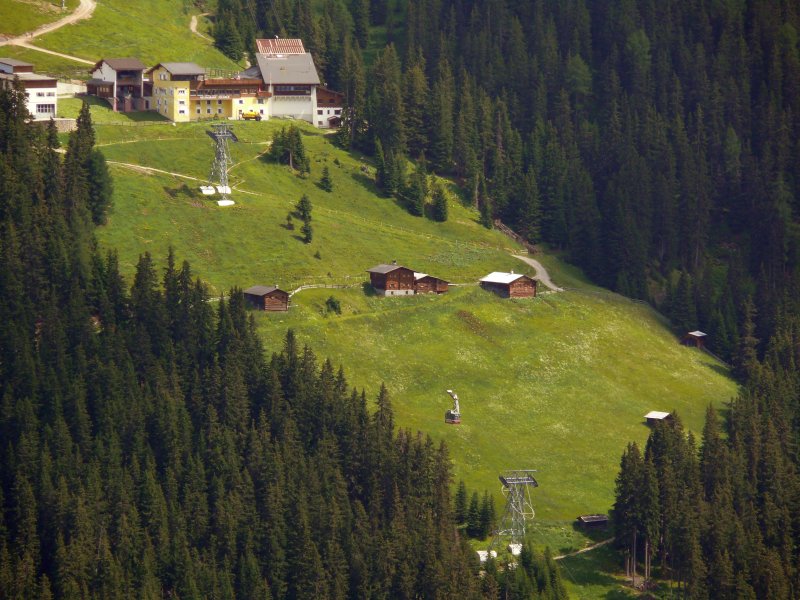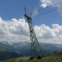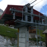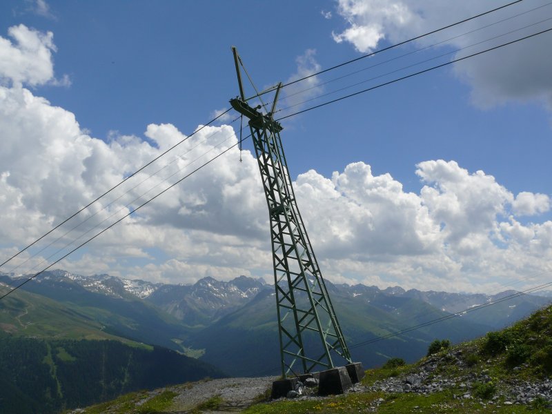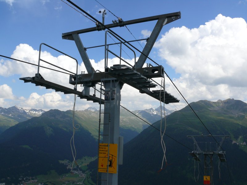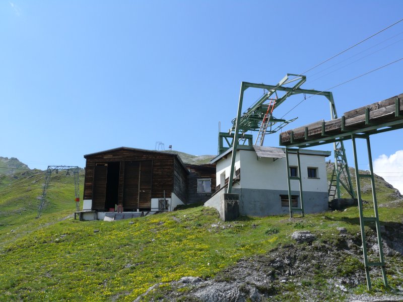 Zoom zur Bergstation der Von Roll-Luftseilbahn im Pischa-Skigebiet, Juli 2009