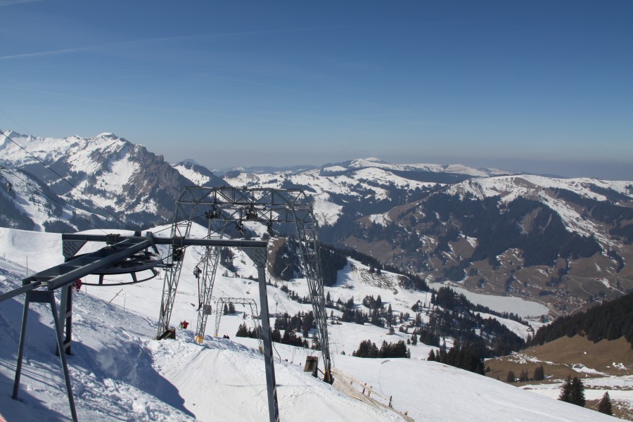 Schlepplifte Geissalp mit der Spitzflue. Im Hintergrund liegt das Skigebiet von Charmey, März 2011