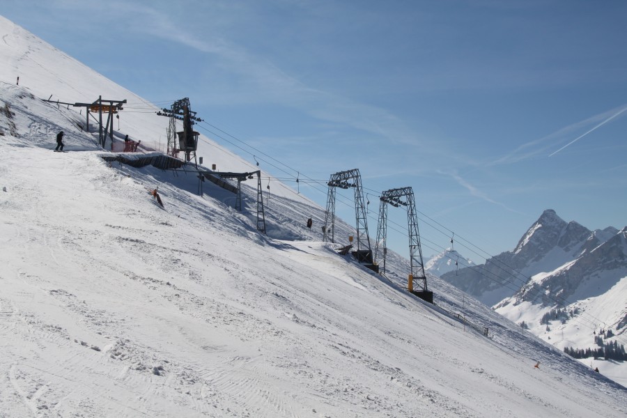 Schlepplifte Geissalp, dahinter im Talboden der Schlepplift Riggisalpboden, März 2011