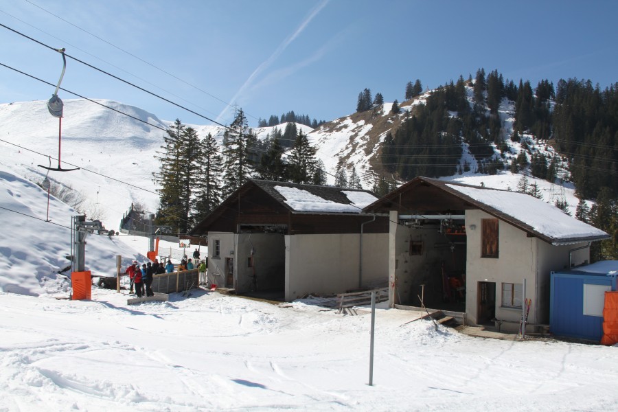 Bergstationen der Schlepplifte Geissalp. Der linke, ältere, Lift von 1956 ist etwas kürzer als die Anlage von 1963, März 2011