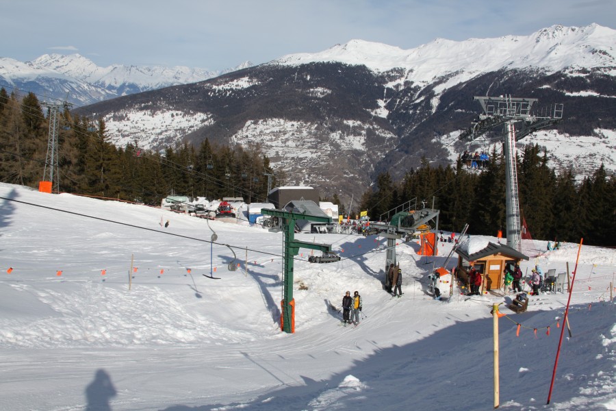 Talstation des Schlepplifts Muraz, dahinter links die Sesselbahn Les Masses-Les Collons sowie rechts die Sesselbahn Les Collons-L'Etherolla, Februar 2012