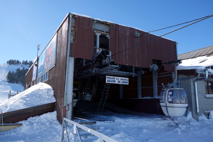 Talstation der Kabinenbahn Thollon-les-Mémises, einziger Zubringer in das Skigebiet oberhalb des Genfer Sees. Bei der Bahn handelt es sich um eine weitgehend originale Poma-Eiergondelbahn, die allerdings im kommenden Sommer ersetzt werden soll, März 2013