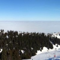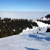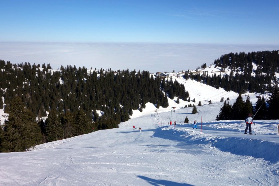 Panorama vom Schlepplift Tétras auf dessen Hauptabfahrt, dahinter die Bergstation der Kabinenbahn und das Nebelmeer, das sich vom Genfer See bis hin zum Juragebirge erstreckt, März 2013