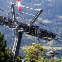 Kreuzeckbahn, eine Zweiseilumlaufbahn, im Skigebiet von Garmisch-Partenkirchen. Dahinter die Alpspitz-Luftseilbahn von Habegger, September 2014