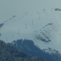 Zoom vom Val d'Anniviers zur Rinderhütte: Zu sehen sind der Schlepplift Waldegg von Städeli, die Luftseilbahn zur Rinderhütte von Von Roll sowie die zweite Sektion der Von Roll Kabinenbahn zur Torrentalp, März 2008