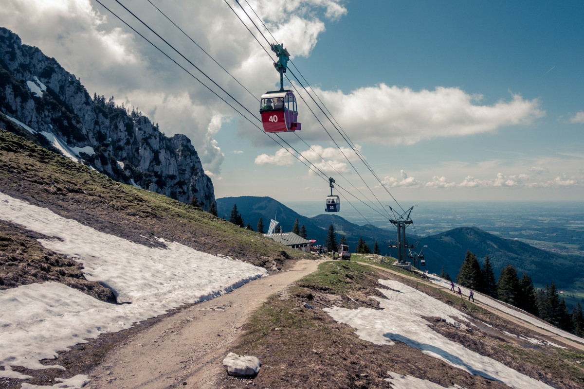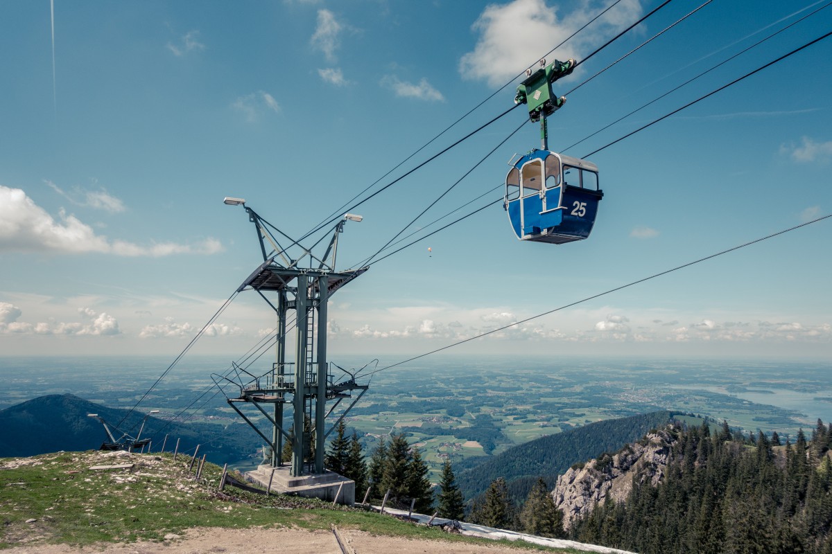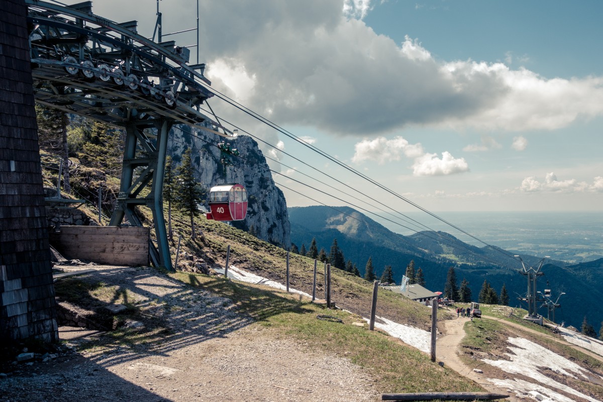 Von Aschau im Chiemgau führt eine Zweiseilumlaufbahn der Firma Hasenclever auf die Kampenwand. Nicht nur das Seilbahnunikat ist eine Reise wert, sondern auch die Aussicht auf die bayerischen Alpen und den Chiemsee.