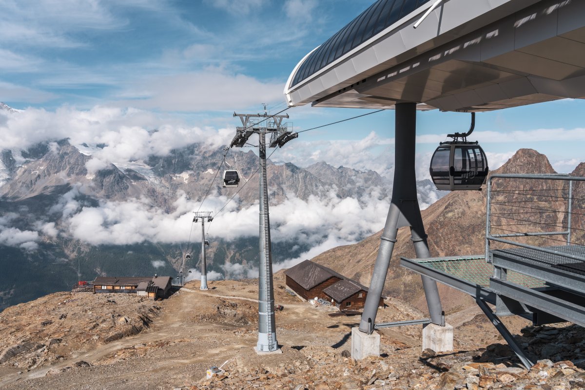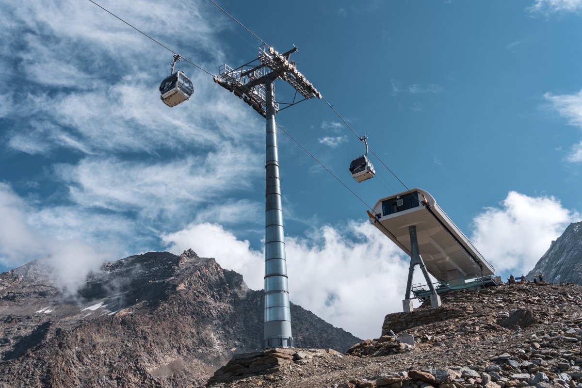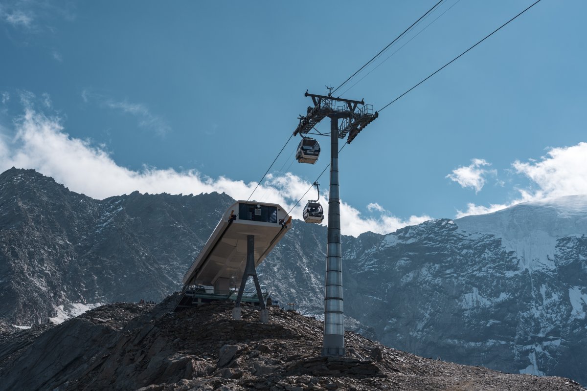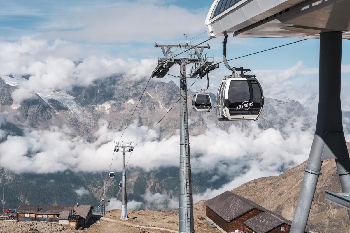 Zwei Sektionen Kabinenbahn von Leitner und Garaventa erschliessen den 3100 Meter hoch gelegenen Hohsaas oberhalb von Saas-Grund mit famosen Ausblicken auf die umliegende Gletscherwelt.