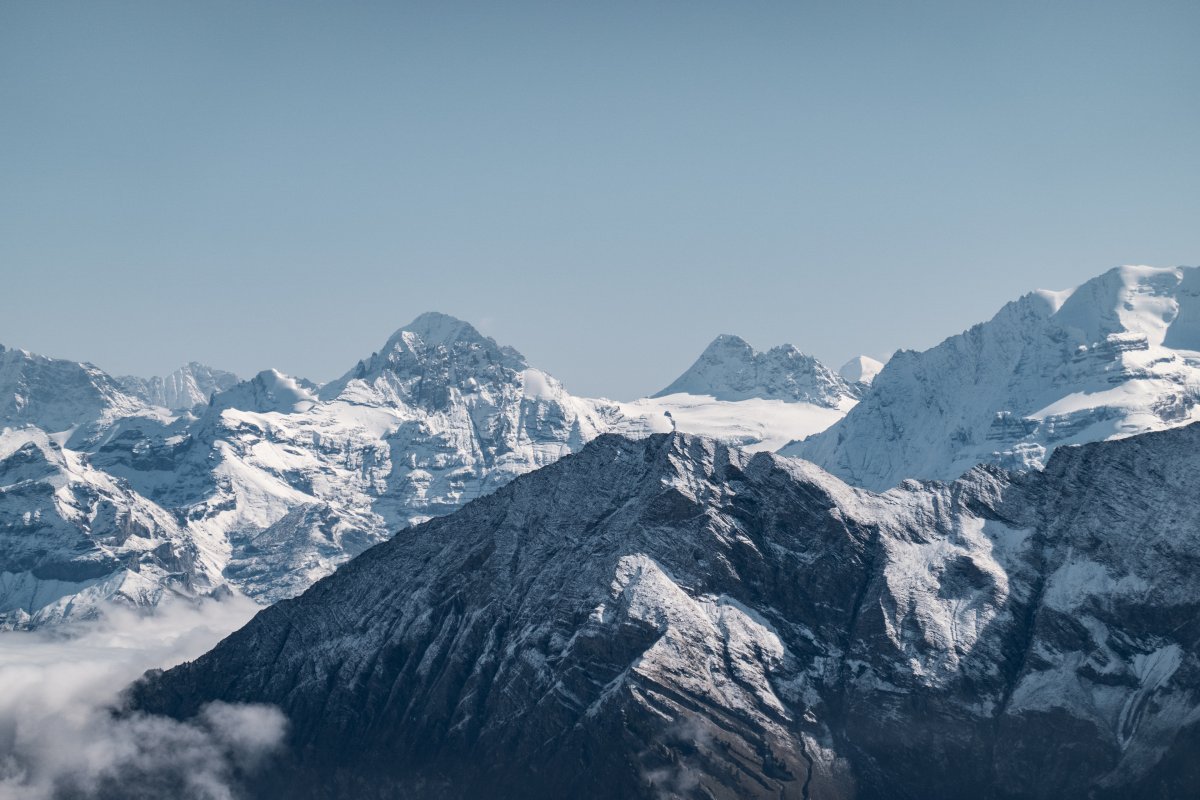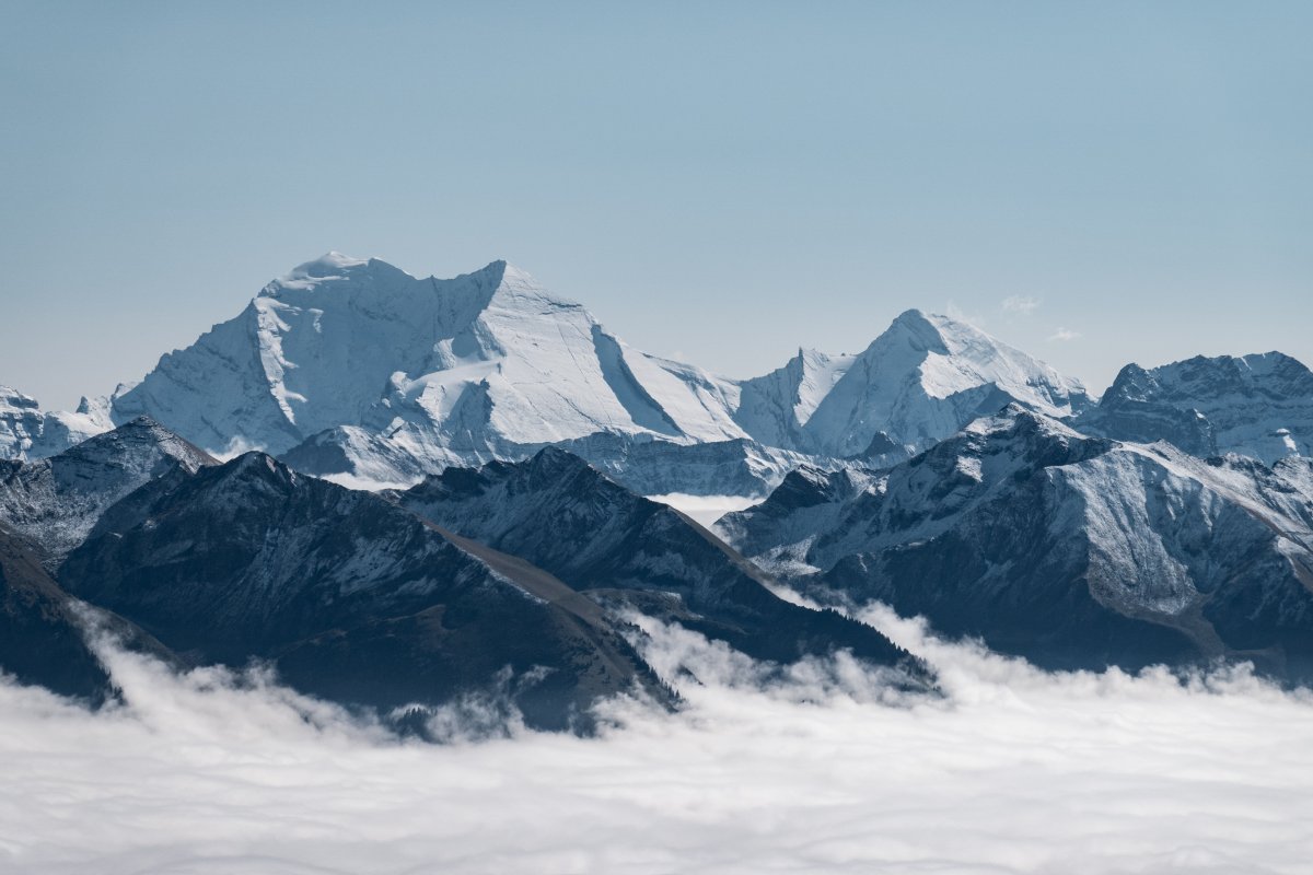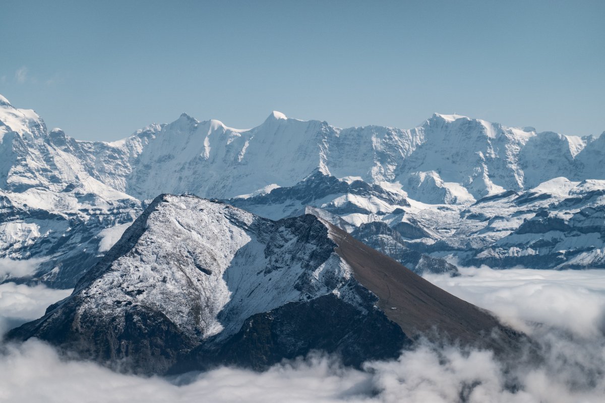 Beeindruckendes Panorama vom Stockhorn an einem herbstlichen Hochnebel-Tag. Die beiden generalüberholten Von-Roll-Pendelbahnen geben vor den frisch verschneiten Gipfeln ein bezauberndes Bild ab.