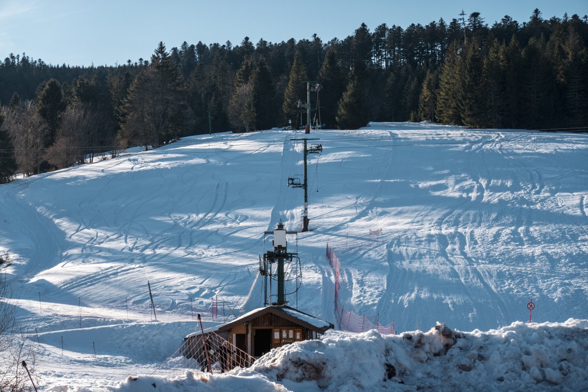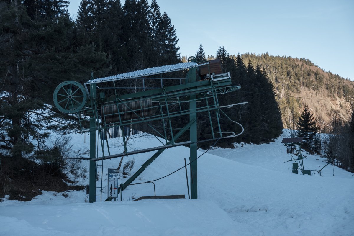 Stillgelegte Schlepplifte im Skigebiet Le Collet-Retournemer nahe La Bresse, Dezember 2021