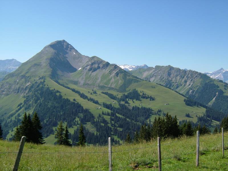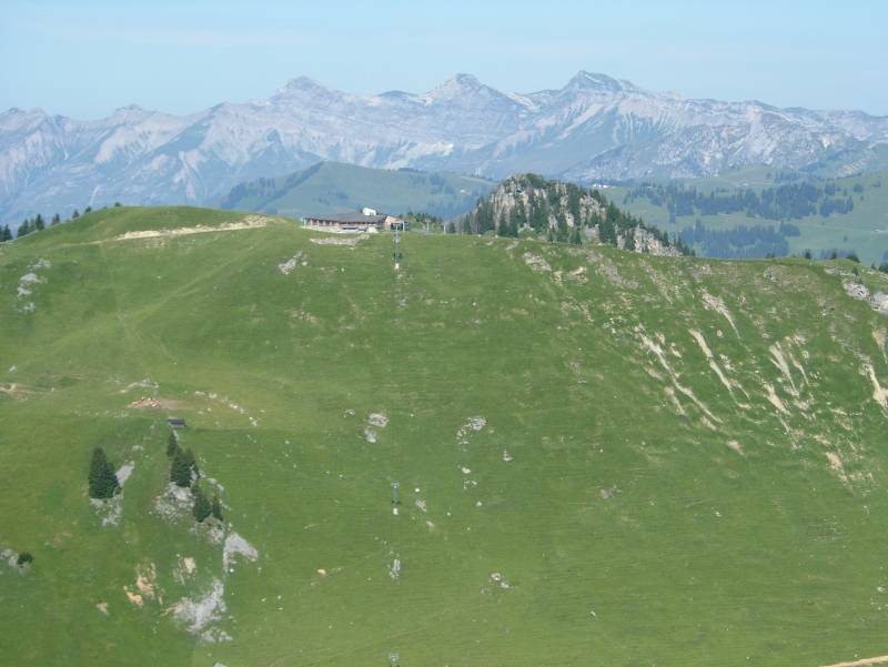 Blick zum Saanerslochgrat. Zu sehen sind die Lifte Sannerslochgrat, Saanerslochgrat-Gandlouenegrat und die Kabinenbahn Saanenmöser-Saanenwald-Saanerslochgrat, Juli 2006