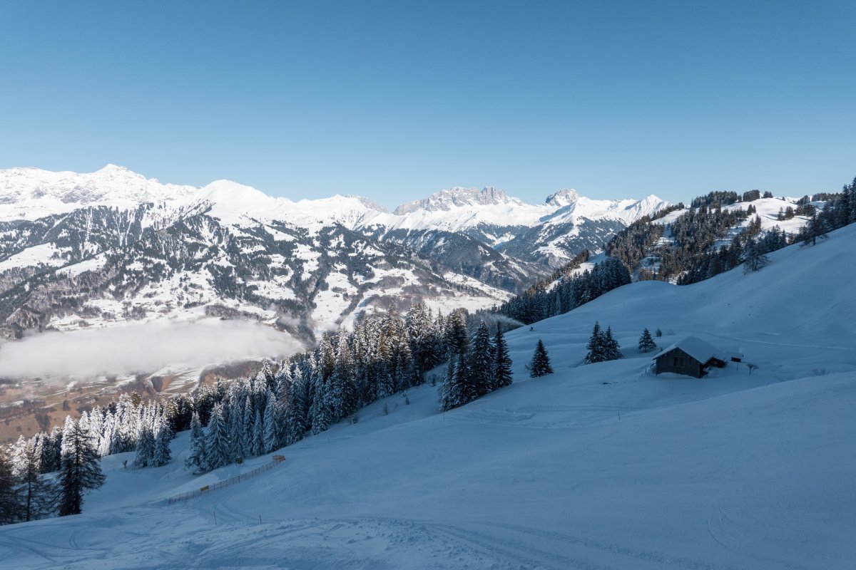 Skigebiet Grüsch-Danusa mit zwei Kabinenbahnen von Leitner, Schleppliften von Leitner und Städeli, sowie einer Sesselbahn von Baco-Poma.