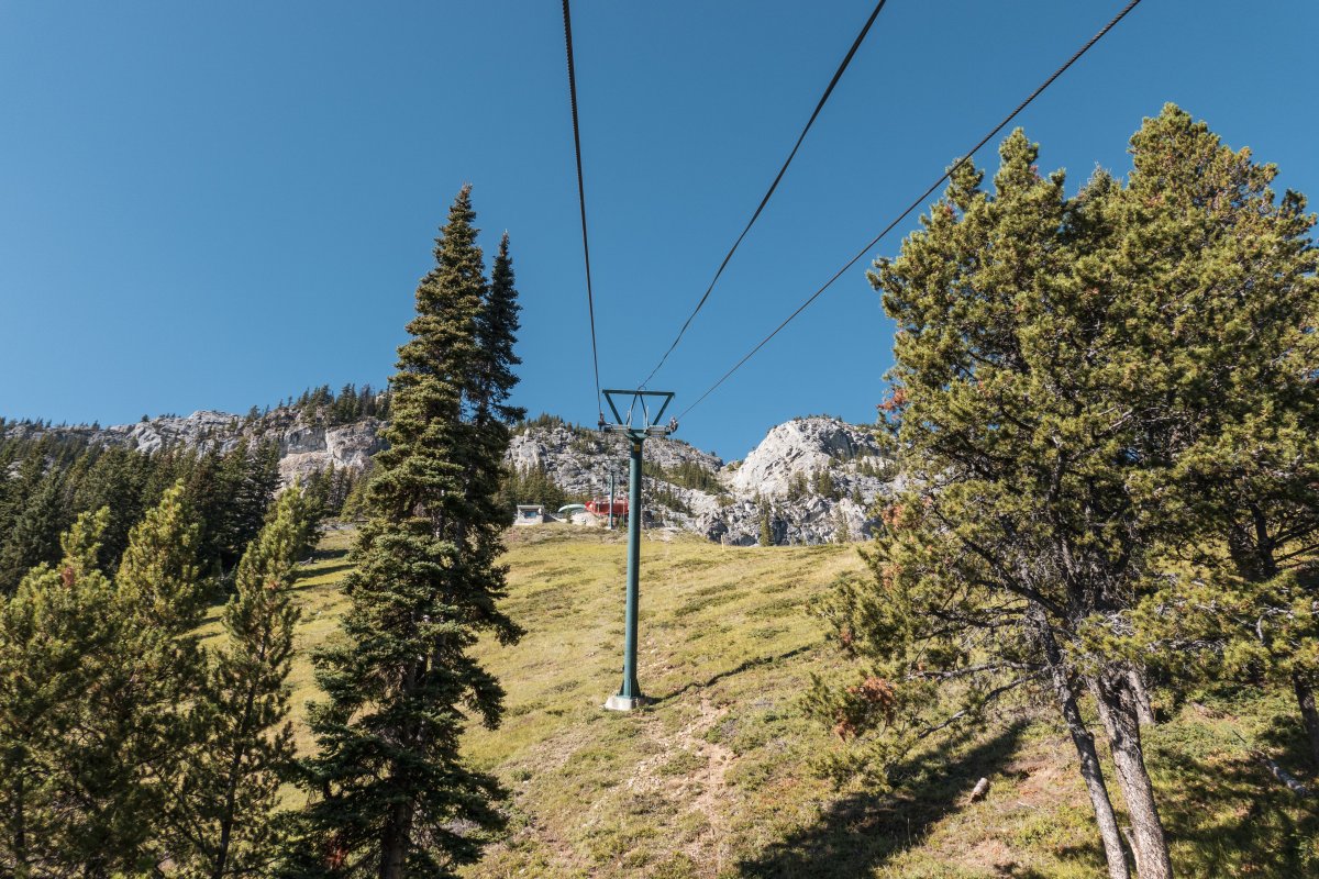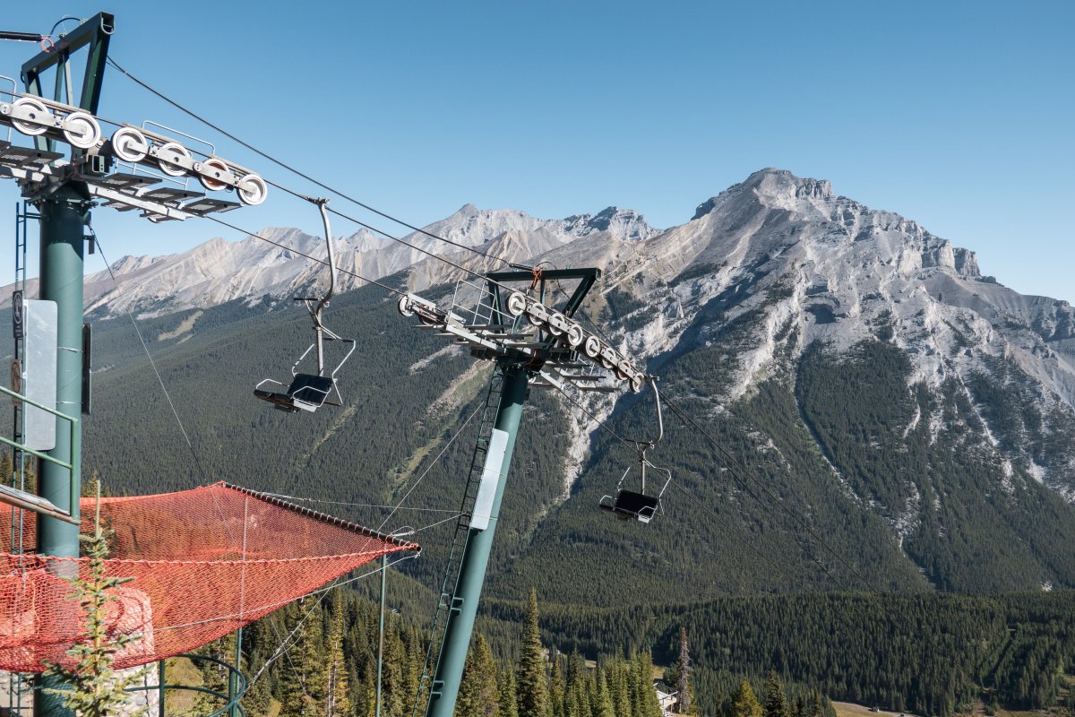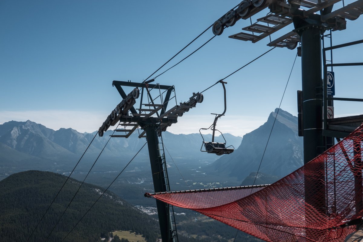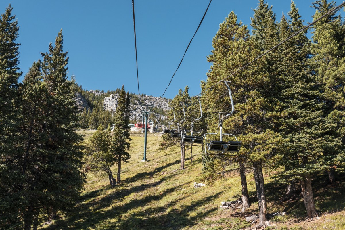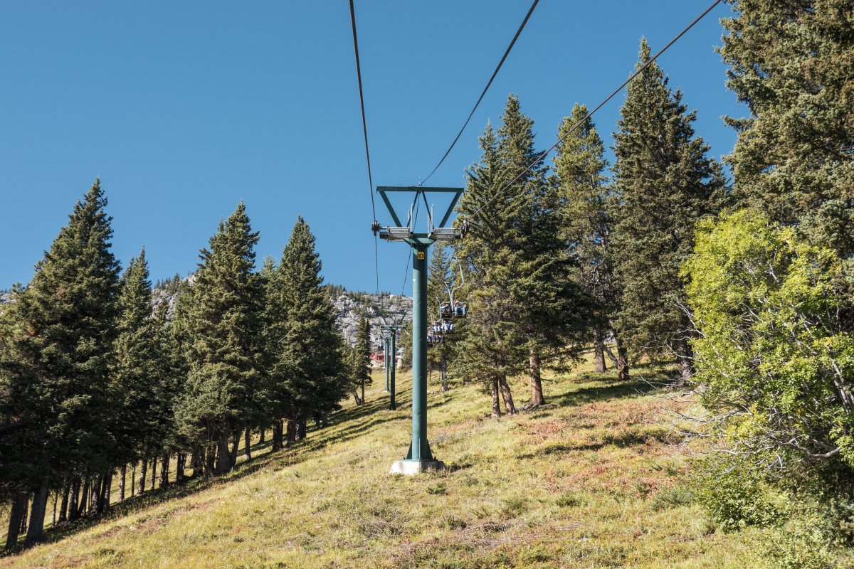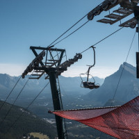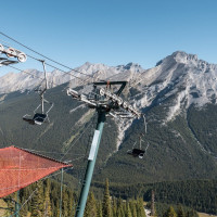 Eine überaus kuriose Gruppenumlaufsesselbahn führt zum höchsten Punkt des Skigebiets Mount Norquay, von dem aus sich ein fulminanter Blick auf Banff und die kanadischen Rockies bietet.