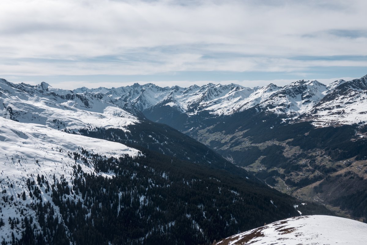 Blick auf das Paznauntal und das Skigebiet Kappl, März 2025